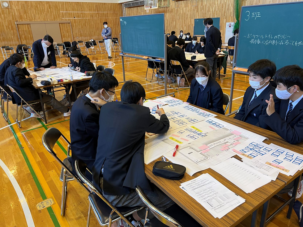 北海道富良野緑峰高校において、同校電気システム科、園芸化学科、総合ビジネス科 の1年生54名にご参加いただき、防災出前講座を開催いたしました。 富良野地域での防災出前講座も、今年で3年目となりました。 当日は、北海道開発局旭川開発建設部及び上川総合振興局旭川建設管理部のご担当官 よりご講演をいただき、生徒たちの防災に関する知識の涵養を図りました。 そのうえで、グループごとに、HUGゲーム(避難所運営ゲーム)を行ってもらいました。 参加した生徒たちは、グループでの協議にも積極的に参加しながら、様々な課題を解 決していました。 また、併せて紹介した段ボールベッドには、生徒はもちろん先生方にも関心を持って いただいており、防災に対する意識の高まりがみられました。 | |||